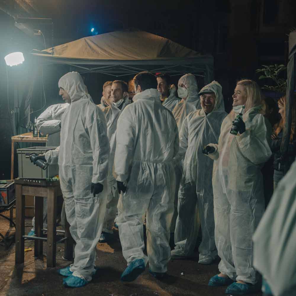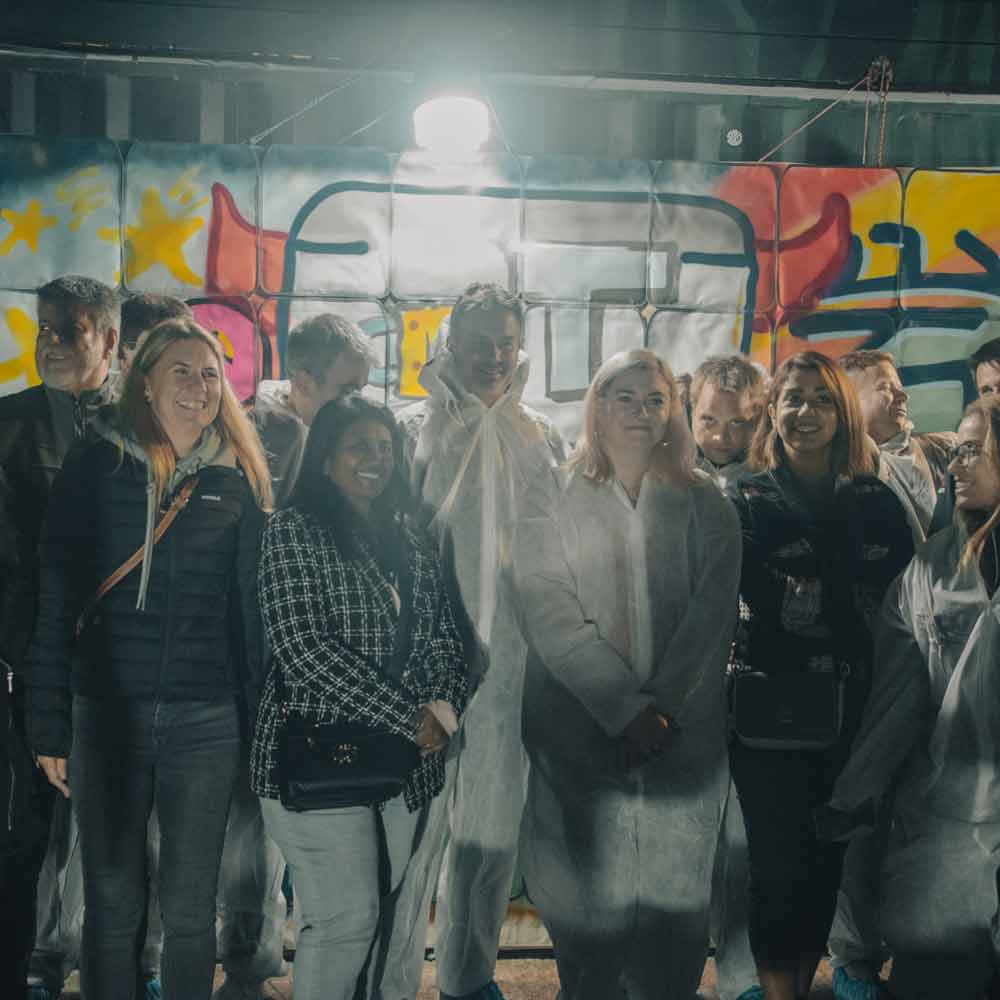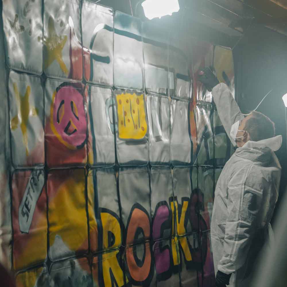 Nach dem Brainstorming für das Teamevent erhielten unsere Gäste die passende Schutzkleidung sowie eine Einführung in den Umgang mit Spraydosen und in die Gestaltung der Graffiti-Taschenmauer. Danach konnten sich die Teilnehmer*innen frei kreativ entfalten und ihre Ideen direkt umsetzen.