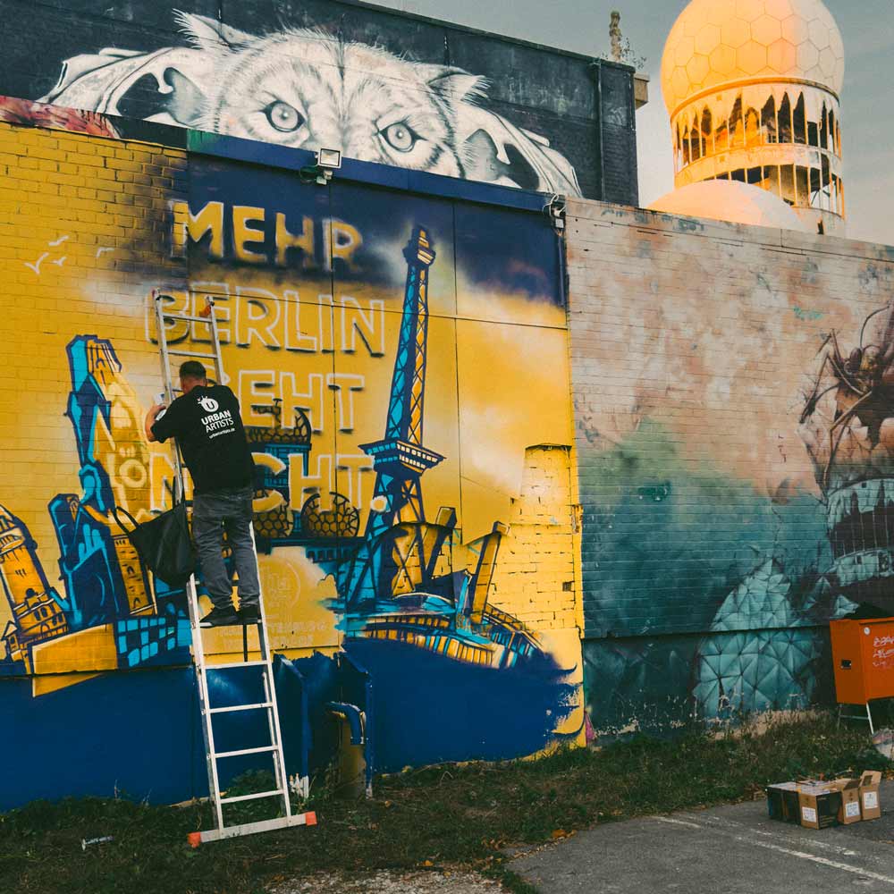 Der Bezirk Charlottenburg / Wilmersdorf ( ChaWi ) hat eine neue Tourismus Kampagne unter dem Namen „Mehr Berlin geht nicht!“ gelauncht und das URBAN ARTISTS Team durfte ein Graffiti & Street Art Kunstwerk für die Veröffentlichung und Pressekonferenz des Bezirks am Teufelsberg realisieren.