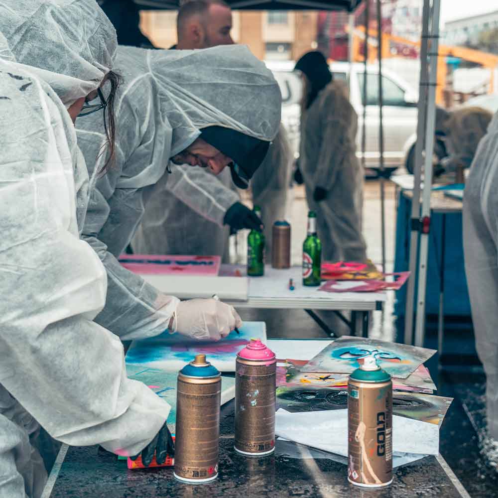Zu Beginn des Workshops erklären unsere Urban Artists den sicheren und effektiven Umgang mit Sprühdosen, sodass alle Teilnehmer*innen direkt beginnen können. Zusätzlich stehen Marker und Schablonen zur Verfügung, mit denen Details, Effekte und individuelle Designs umgesetzt werden können.