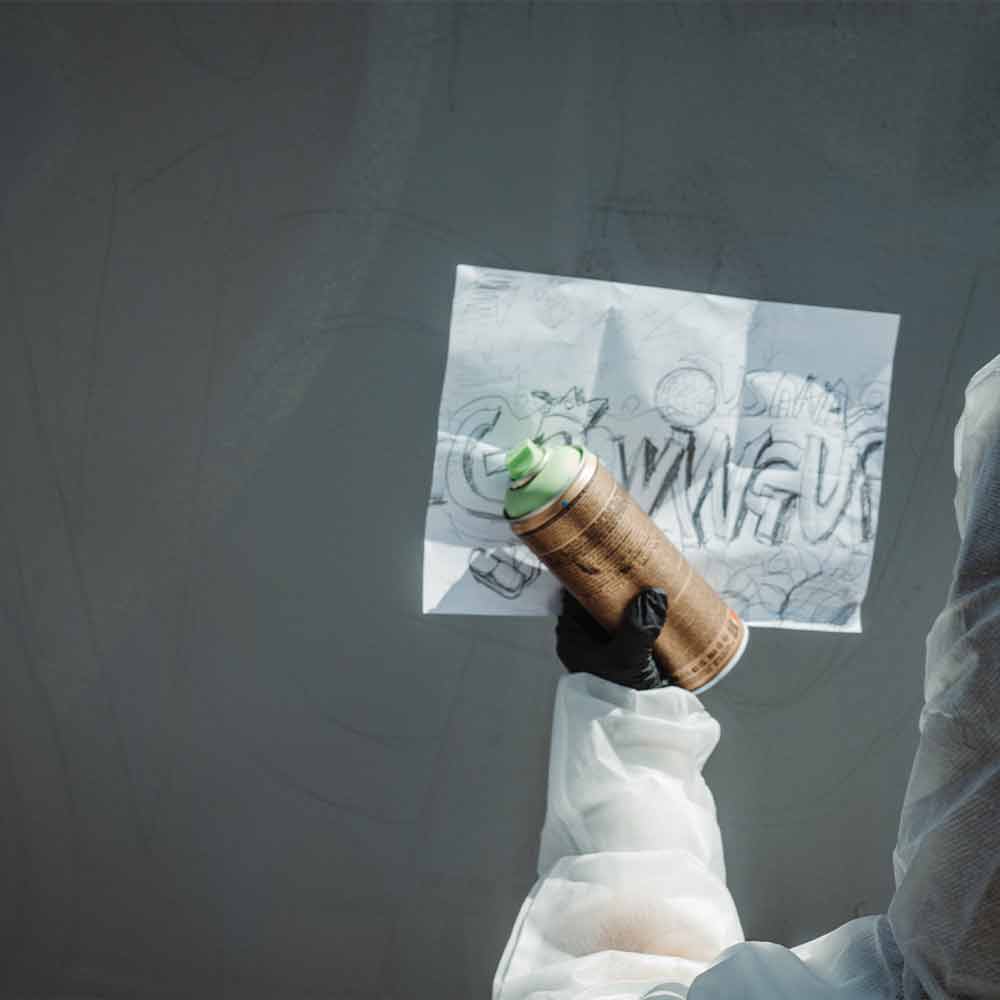 Damit alle Teilnehmer*innen unbeschwert und sicher an der Leinwand arbeiten können, stellen wir auf Anfrage umfangreiche Schutzkleidung bereit. Dazu gehören Masken, Handschuhe, Schuhschoner und weiteres Equipment, das den Umgang mit Sprühdosen, Farben und Schablonen vollkommen sicher macht.